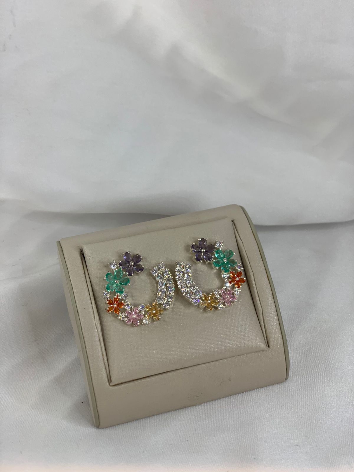 BRINCO COM FLORES COLORIDAS CRAVEJADO PRATA