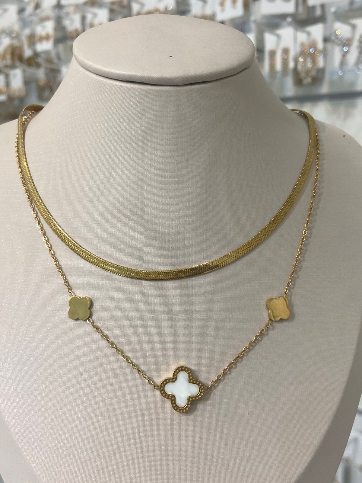 COLAR AÇO DUPLO FITA TREVO MADREPEROLA