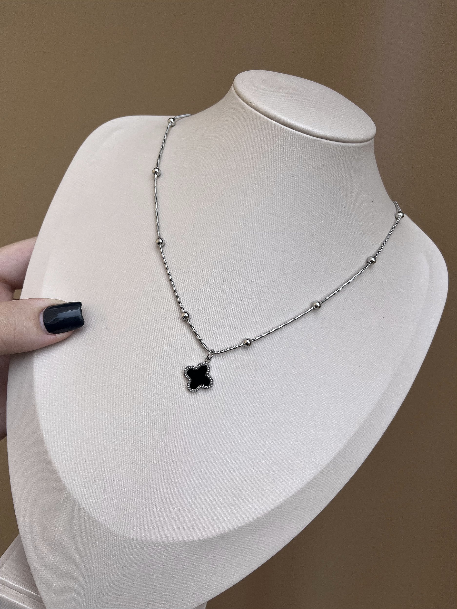 COLAR AÇO INOX BOLINHAS COM TREVO PRETO