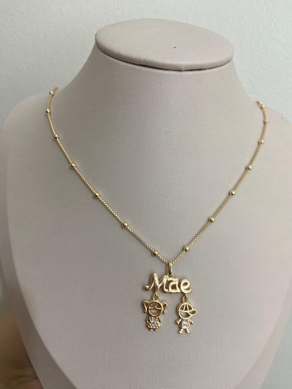 COLAR DOURADO DE BOLINHA E PIN MÃE DE 2 CASAL