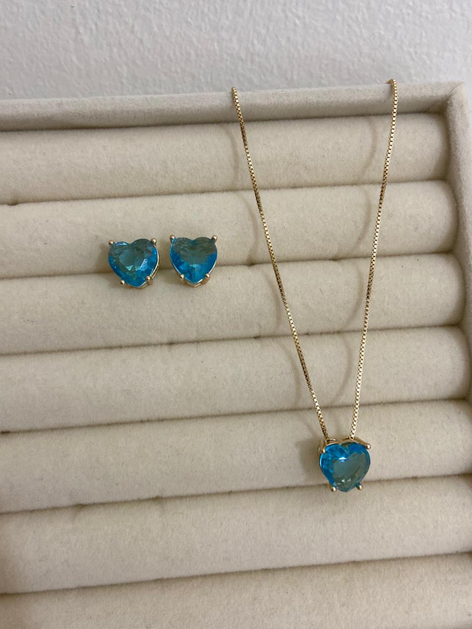 CONJUNTO DOURADO ZIRCÔNIA CORAÇÃO AZUL TURQUESA