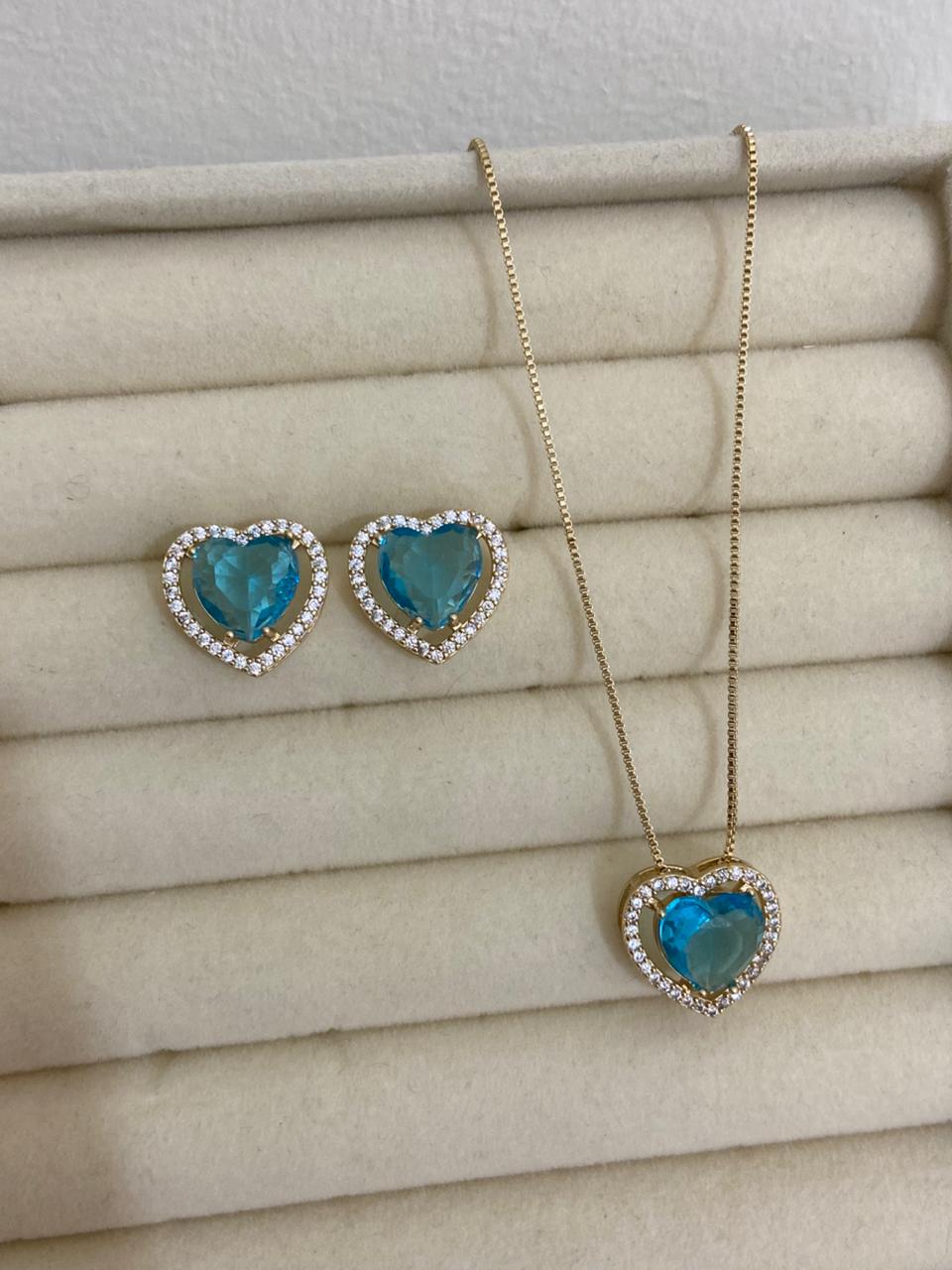 CONJUNTO DOURADO ZIRCÔNIA CRAV CORAÇÃO AZUL TIFFANY