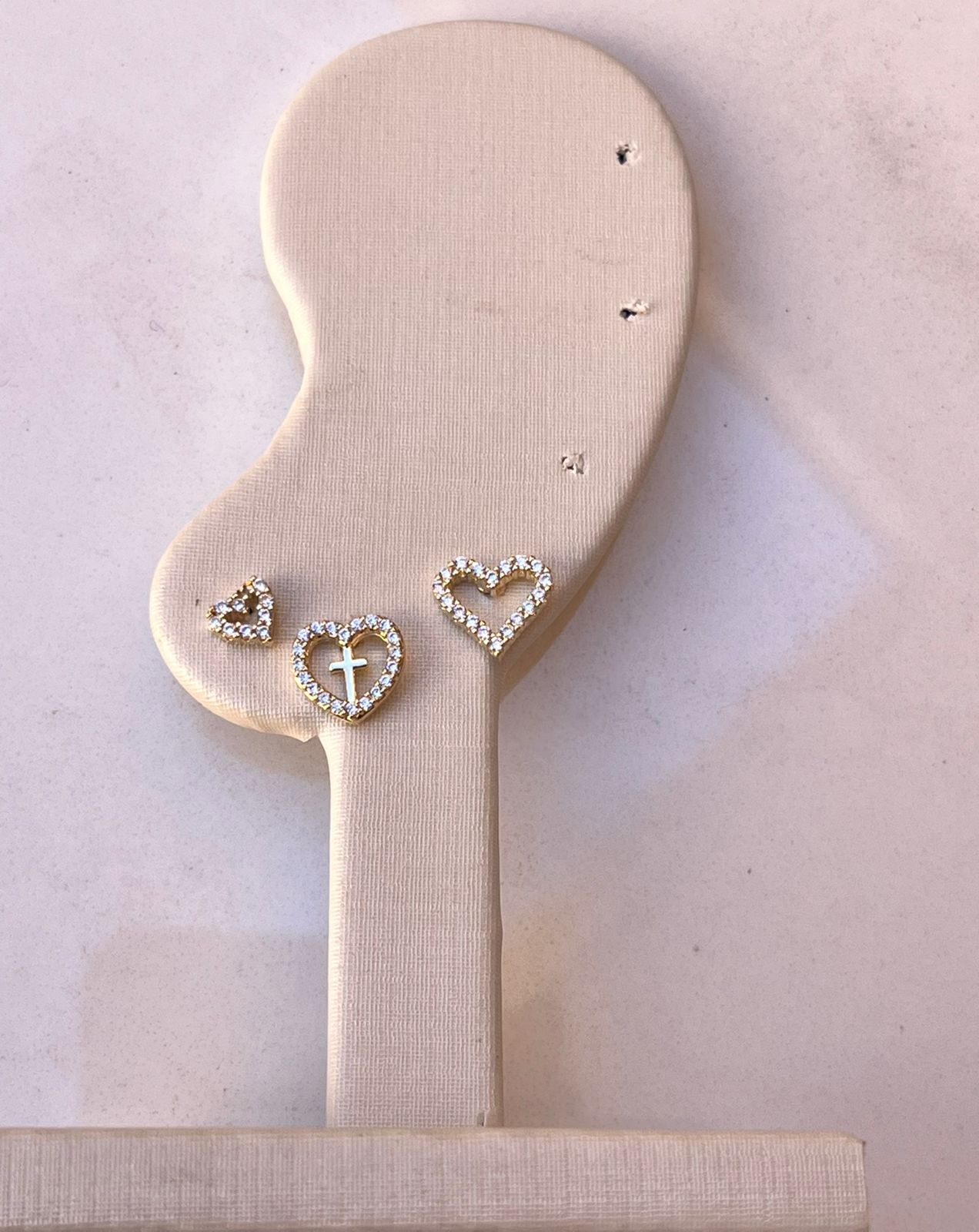 TRIO DE BRINCOS CORAÇÕES CRAVEJADOS COM CRUZ