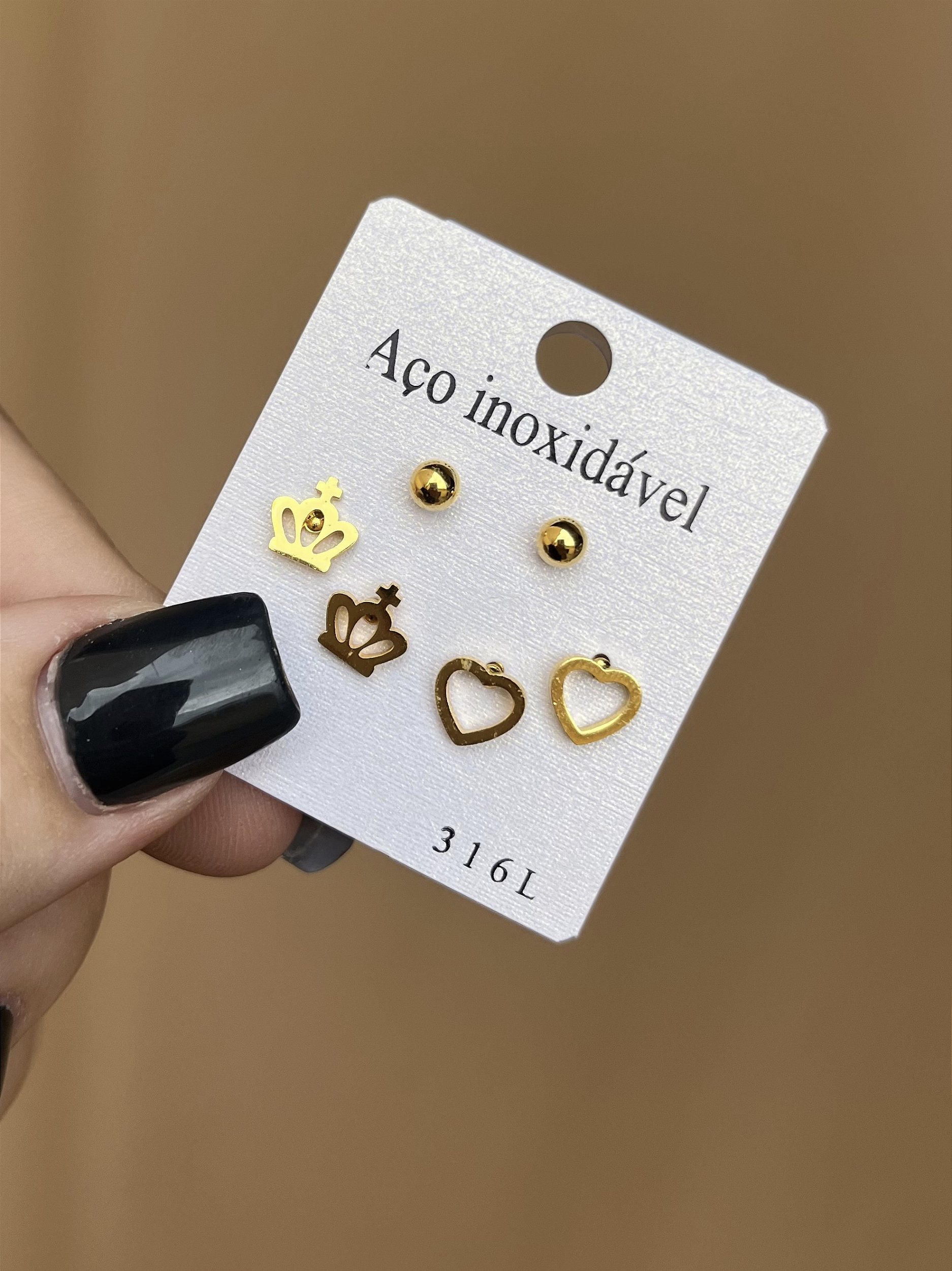 TRIO DE BRINCOS PINO CORAÇÃO COROA DOURADO